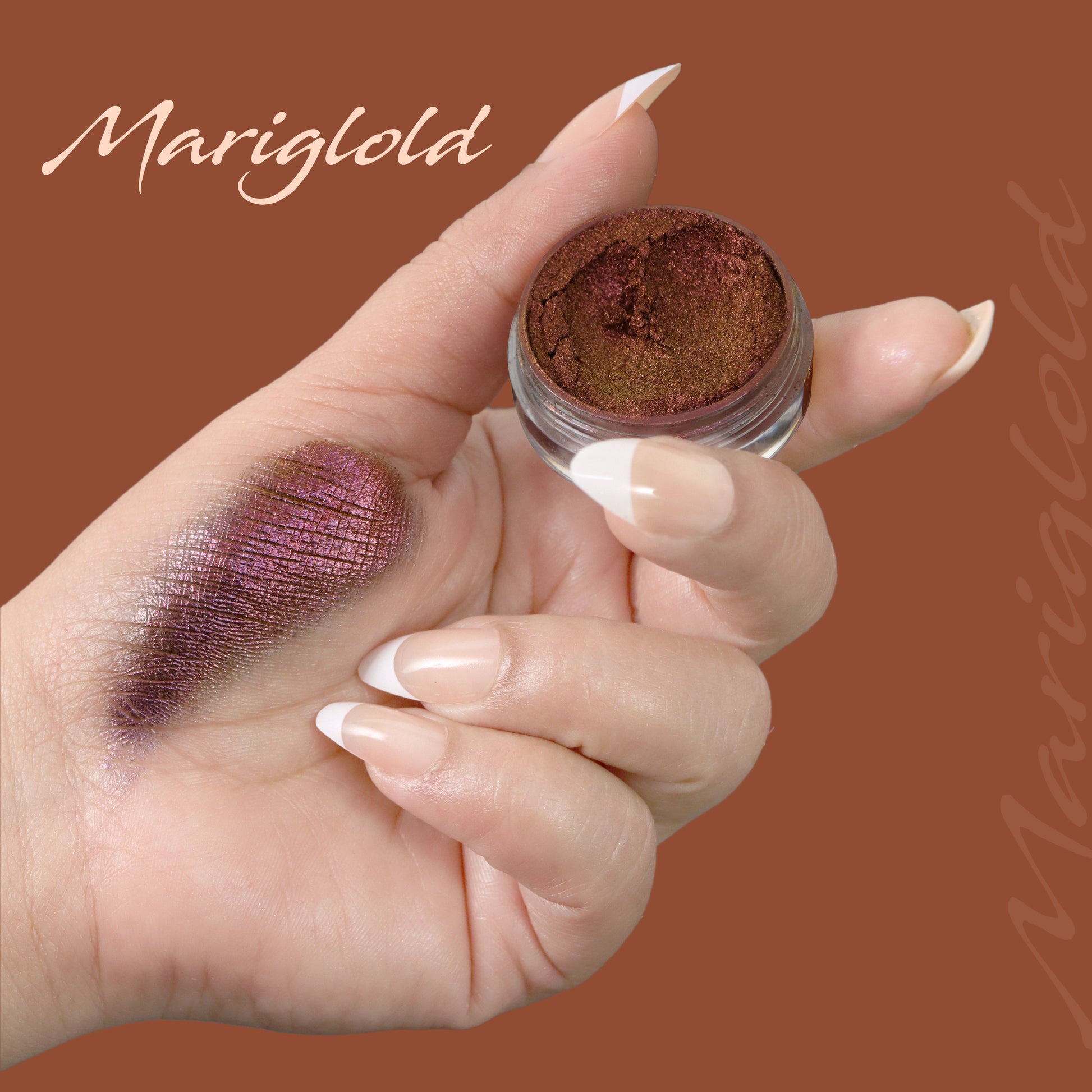 A molten blend of warm copper, bronze, and golden holographic shimmer. Marigold glows with fiery richness, reflecting hints of rose and amber—perfect for festive, bridal, and sunset-inspired eye looks.