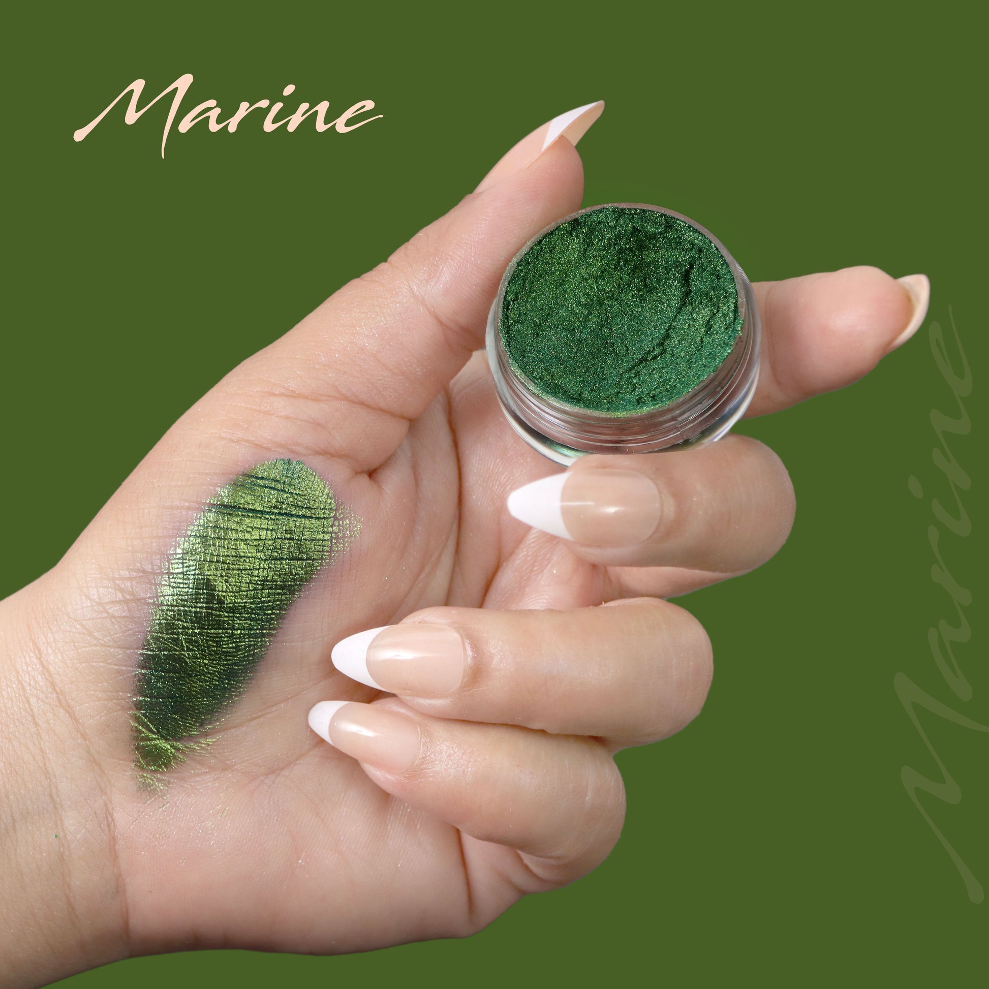 A deep oceanic green with cool-toned holographic blue and emerald shifts. Marine captures the mystery of the sea, delivering a bold, high-shine finish that transforms beautifully under light.