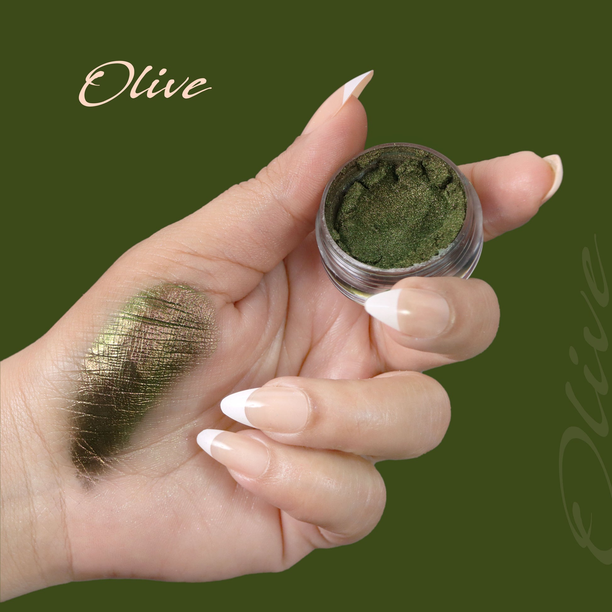 A muted olive green enriched with antique gold and khaki holographic reflects. Olive is earthy yet striking—ideal for sophisticated glam, smokey transitions, and modern neutral looks with a twist.