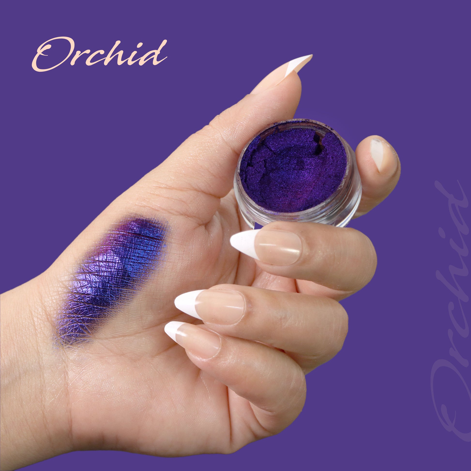 A royal purple pigment with intense blue and violet holographic shifts. Orchid is bold, luxurious, and dramatic—perfect for statement eyes that demand attention and depth.