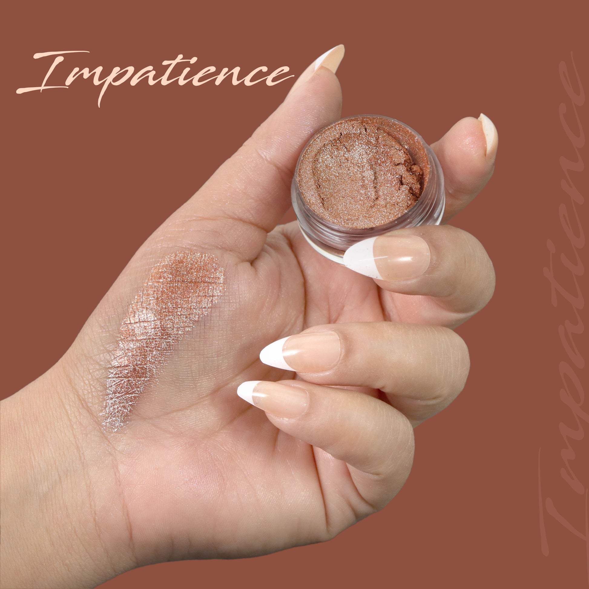 A fiery copper with intense metallic warmth. Impatience ignites the eyes with a vibrant, high-shine finish, delivering instant impact and bold dimension in just one swipe.